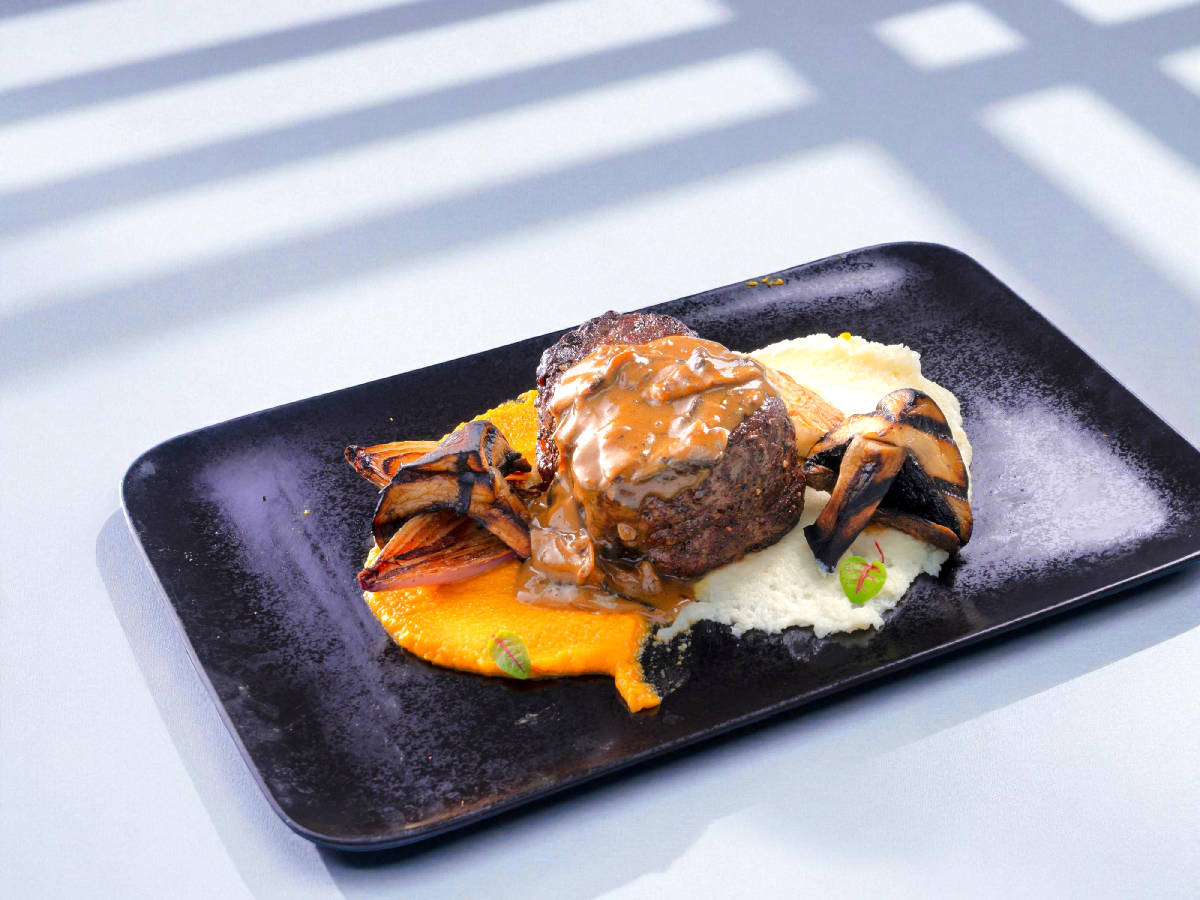 Black angus tenderloin, served with mashed potatoes, carrot puree, sautéed shallot and portobello
